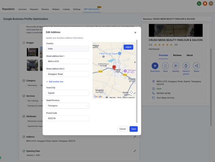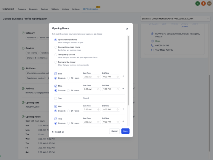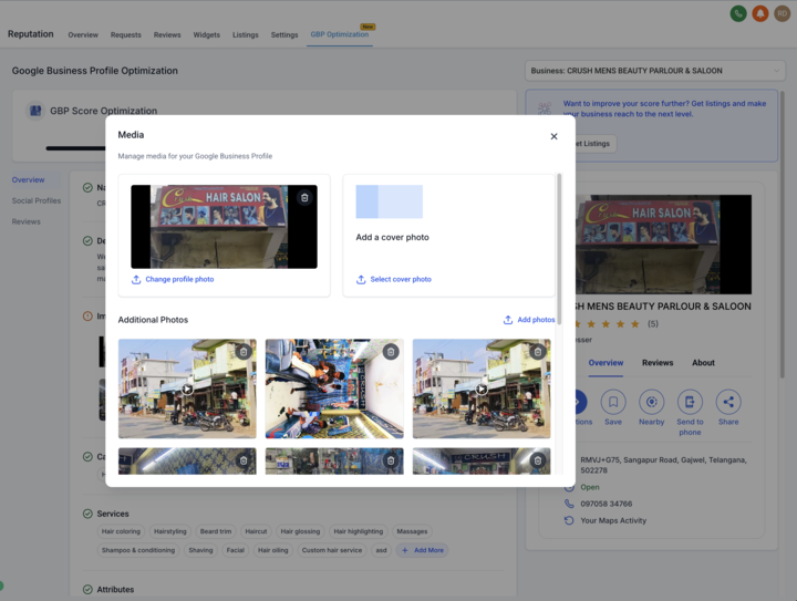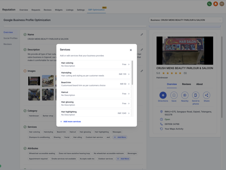 Update essential profile details — from business name and phone number to images, services, and attributes — without leaving the Reputation tab.