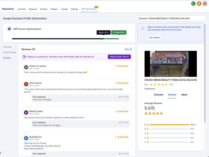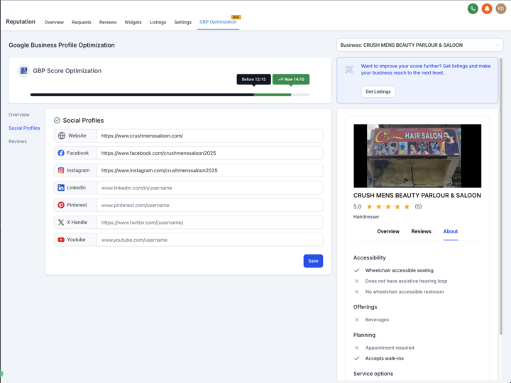 We’re excited to introduce GBP Optimization, a powerful new feature that helps businesses effortlessly manage and enhance their Google Business Profile (GBP) right inside the Reputation tab. With this launch, agencies and their clients can update key GBP details, keep listings complete and engaging, preview changes live, and boost local visibility — all in one place.